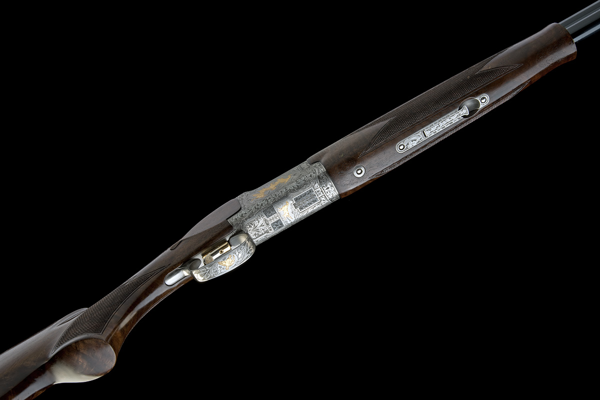 for 1995, 28in. nitro barrels with 10mm ventilated matt top-rib, 3in. chambers, multichokes (no spares), hold-open toplever, manual safety with integral barrel selector switch, adjustable gold-washed trigger, bold acanthus scroll engraving with gold-inlaid game scenes of pheasant, duck, partridge and hound, 14 3/8in. figured pistolgrip stock including 3/4in. recoil pad, weight 6lb. 15oz.