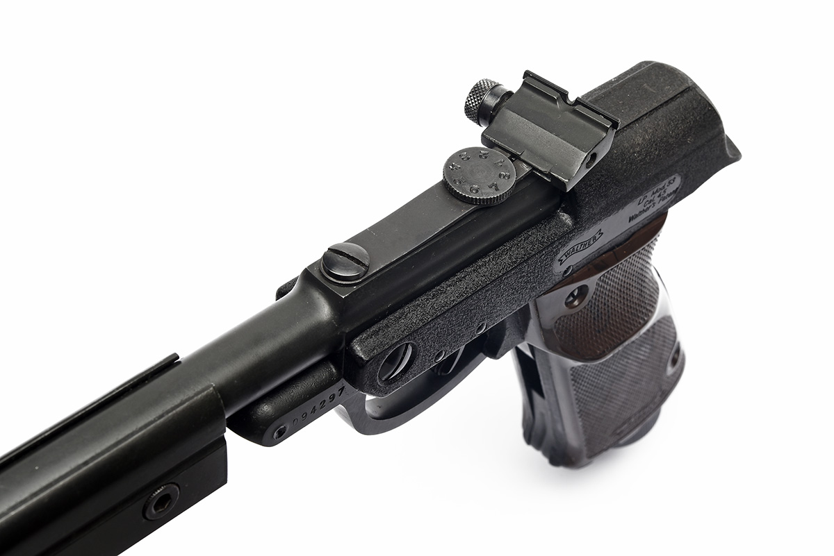 circa 1978, with blacked 9 1/2in. barrel, ramp fore-sight, micro adjustable rear-sight, the barrel currently fitted with a Walther auxiliary muzzle-weight, black crackle-finished receiver, brown chequered plastic grips and cocking link forming the trigger-guard, generally collector's external condition