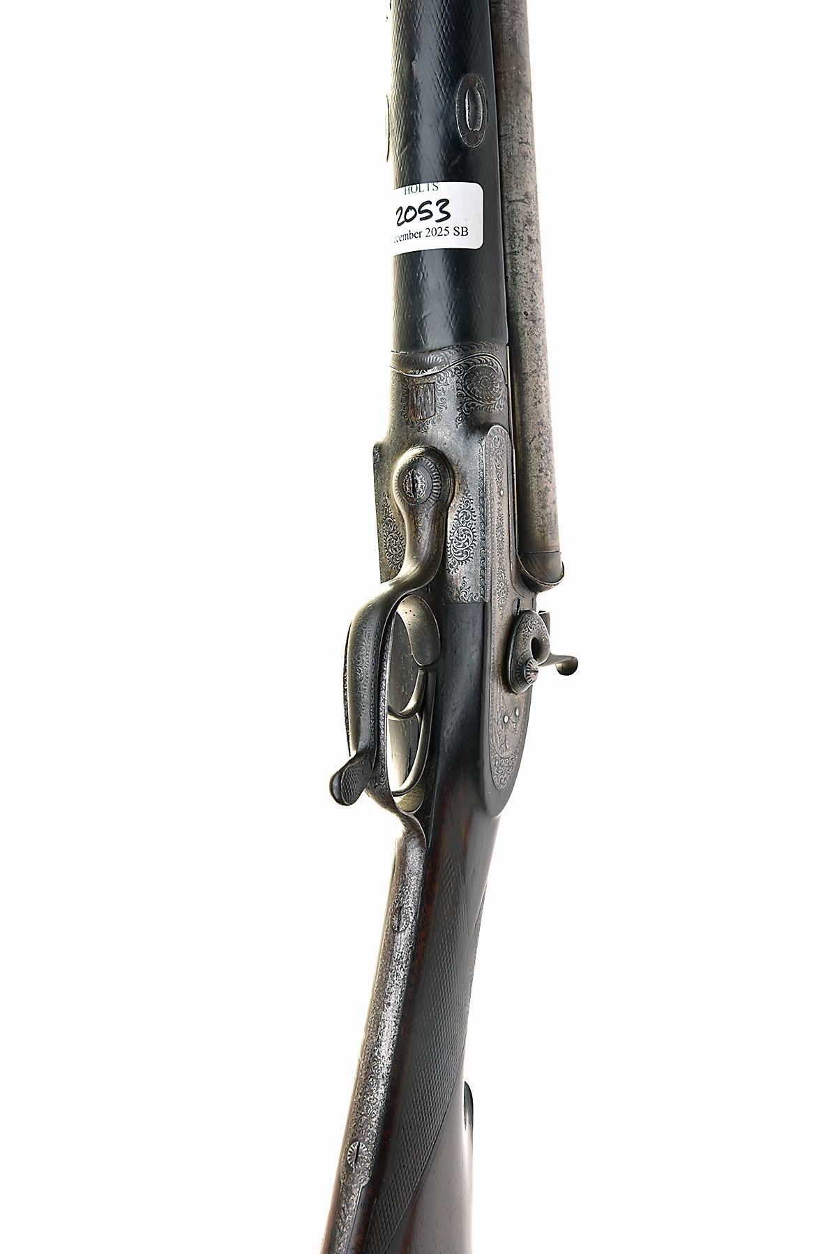 'CONVERTED BY J. PATSTONE' 10-BORE ROTARY-UNDERLEVER HAMMERGUN, n.v.s.n., circa 1860, 27 3/4in. damascus barrels, rib engraved 'CONVERTED BY J. PATSTONE. LATE CLAYTON. SOUTHAMPTON.', 2 5/8in. chambers, bored approx. true cyl. in both, carved serpentine fences, rebounding locks, border and partial scroll engraving with vignettes of hound and game, 14in. stock