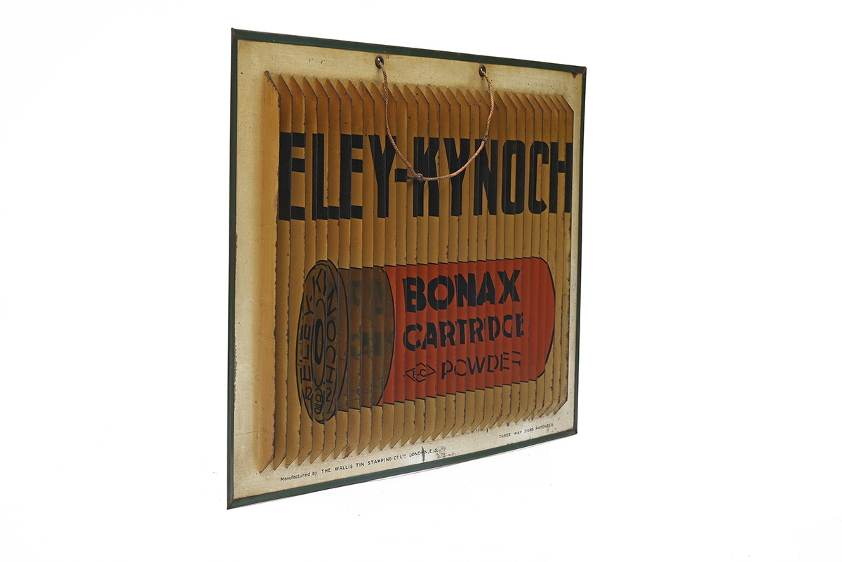 A SCARCE ELEY TIN-PLATE 3-D ADVERTISING SIGN FOR PRIMAX, GRAND-PRIX AND BONAX CARTRIDGES SIGNED WALLIS TIN STAMPING CO.,