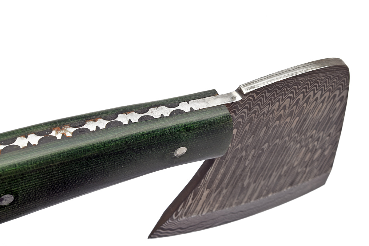 A HANDMADE DAMASCUS STEEL CHOPPER, approx. 4in. blade, measuring approx. 8in. overall, leather belt scabbard