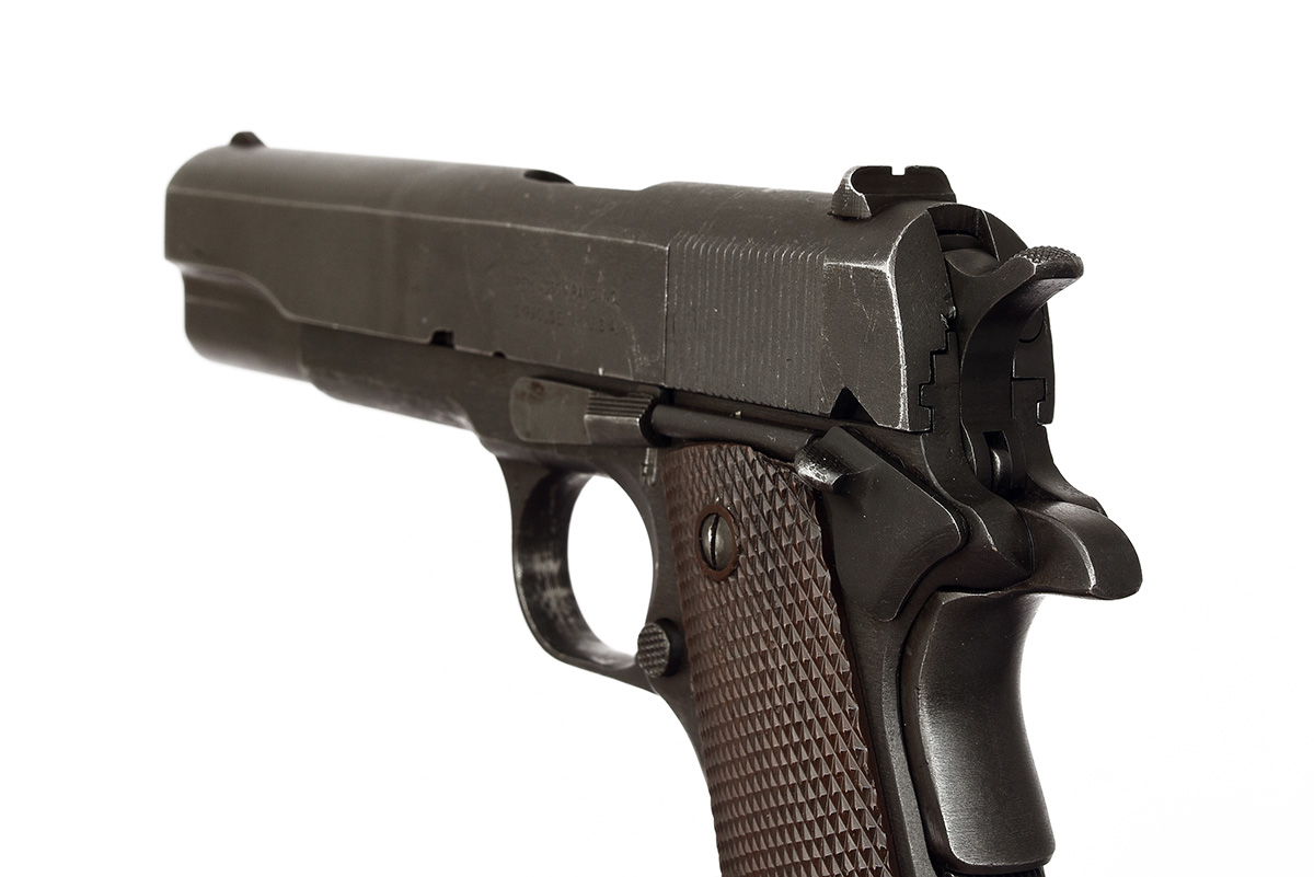 for 1943, with 5in. barrel, grey phosphated slide with Remington markings, original open-sights, phosphated frame with arched mainspring housing, grip-safe, exposed hammer and chequered brown plastic grips, much original military finish remaining