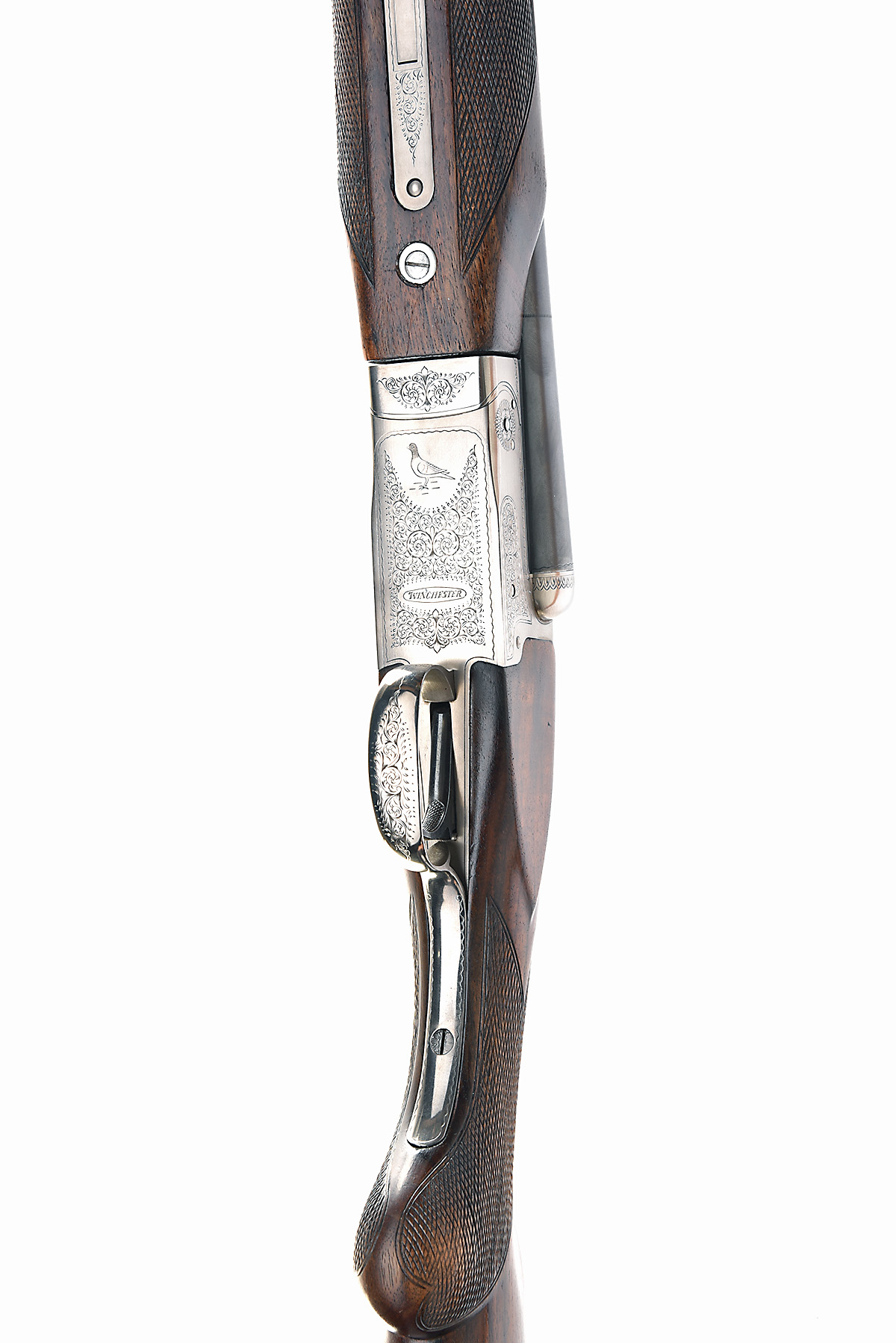 WINCHESTER 12-BORE 'PIGEON GRADE' SINGLE-TRIGGER BOXLOCK EJECTOR, serial no. PWK003804, circa 1980, 28in. nitro barrels with ventilated rib, 3in. (magnum) chambers, bored approx. 1/4 and 3/4 choke, automatic safety with integral barrel selector switch, border and partial scroll engraving, 15in. semi-pistolgrip stock including 1in. rubber recoil pad, weight 7lb. 8oz., in a Beretta universal case
