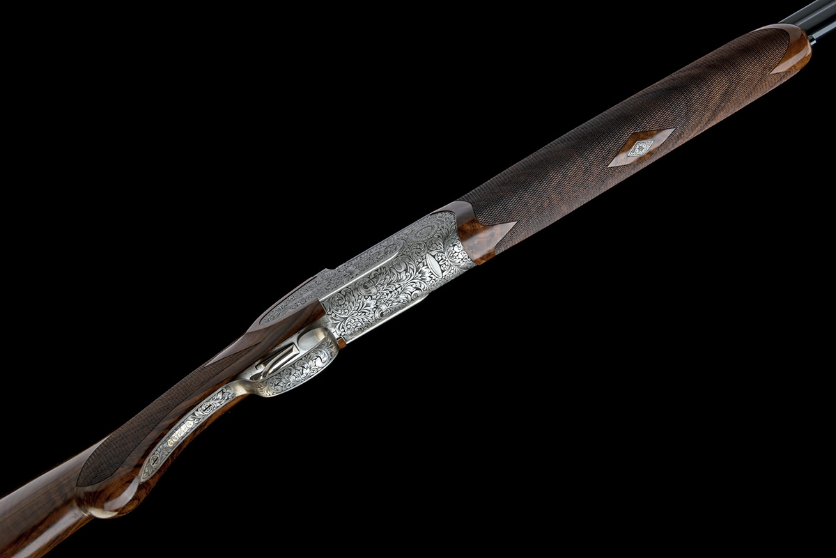 for 2015, 28in. nitro barrels with tapered solid matt top-rib, 2 3/4in. chambers, multichokes (with spares), the over barrel engraved 'RIZZINI MARCHENO V.T. ITALY ESPECIALLY MADE FOR J. ROBERTS', hold-open toplever, automatic safety with integral barrel selector switch and gold-inlaid 'SAFE' detail, the action, furniture and decorative sideplates finely engraved with bold scrolling acanthus and stylised foliate motifs, the sideplates with central ornate cartouches engraved 'A.T. MILES & SONS', the triggerguard tang inlaid in gold drop shadow with the serial number, 14 7/8in. well-figured semi-pistolgrip stock, weight 6lb. 5oz., in its universal case