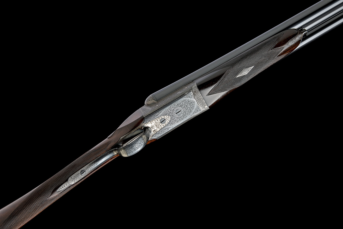 for 1908, serial number on barrel loop only and Holloway number H6691 on under rib, 28in. nitro barrels, the rib engraved 'W. HORTON. BUCHANAN ST. GLASGOW' and with acanthus scroll detailing at the breech end, 2 1/2in. chambers, bored approx. imp. cyl. and 1/2 choke, treble-grip action with intercepting sears, automatic safety with gold-inlaid 'SAFE' detail, patent single trigger with ovate triggerguard, retaining traces of colour-hardening and renewed finish, 14 1/8in. figured stock, weight 6lb. 7oz.