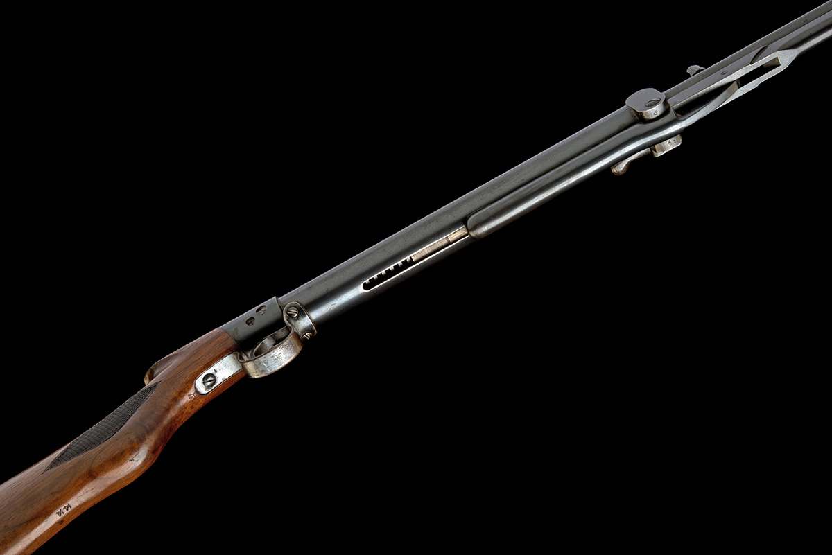 for 1919, with blued 19 1/4in. barrel, dove-tailed fore-sight, elevating notch rear-sight, tap-action breech, plain blued air-chamber etched 'THE BSA STANDARD AIR RIFLE .22 BORE (No.2)' over 'THE BIRMINGHAM SMALL ARMS CO. LTD ENGLAND' and 'PATENTED SOLE MAKERS' all above six countries patents with dates and numbers (etching faded but quite legible), chequered walnut saw-handled butt-stock with ribbed heel, no provision for fore-end and push-button release under-lever, much finish remaining