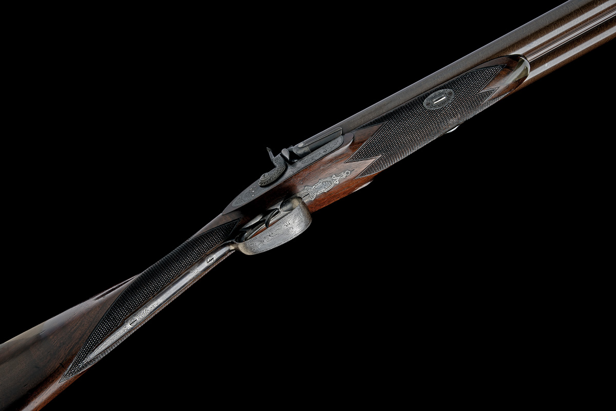 Provenance: According to the Lang ledger, this shotgun was ordered by a Mr Norris as a 'fowler' on 19 January 1861 and completed on 22nd March 1865. The escutcheon engraving has been identified as belonging to Trafford of Trafford Park, Lancashire. It is possible that this shotgun, whilst ordered for fowling, had the specifications changed to suit live pigeon as it retains a ramrod catch at muzzle