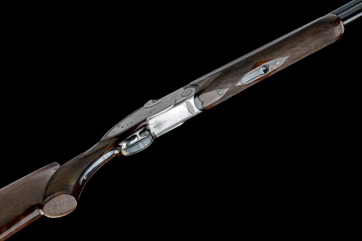 dated 1988, 29 1/2in. nitro barrels with 10mm ventilated matt top-rib, 2 3/4in. chambers, bored approx. 1/2 and full choke, hold-open toplever, manual safety, double rolled-edge triggerguard, border and partial scroll engraving, the underside gold-inlaid with the makers name, bright finish, 14in. pistolgrip stock with raised comb, including 1in. rubber recoil pad, weight 8lb. 7oz., in its makers universal case