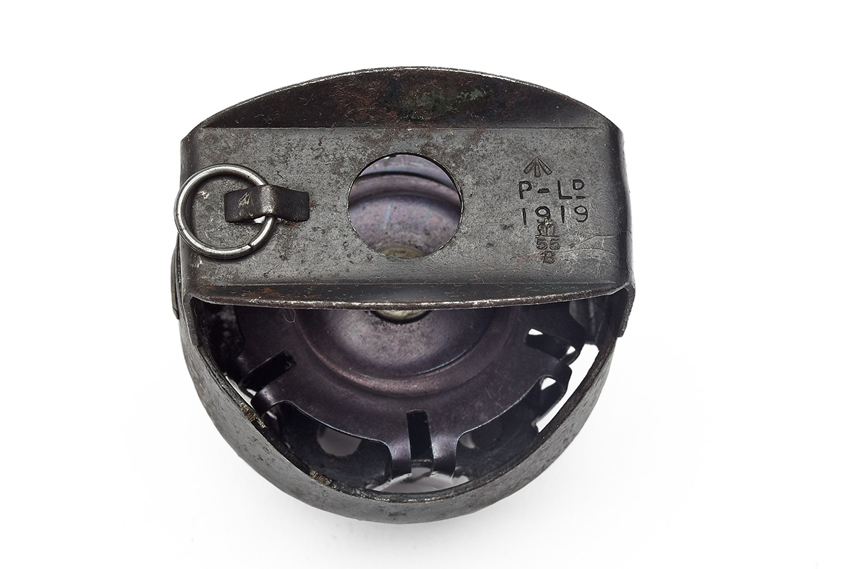 dated for 1919, of usual form with blacked steel body and handle, blued spring fingers, the handle marked with a broad arrow over 'P-Ld' over '1919' and with an ordnance inspectors mark