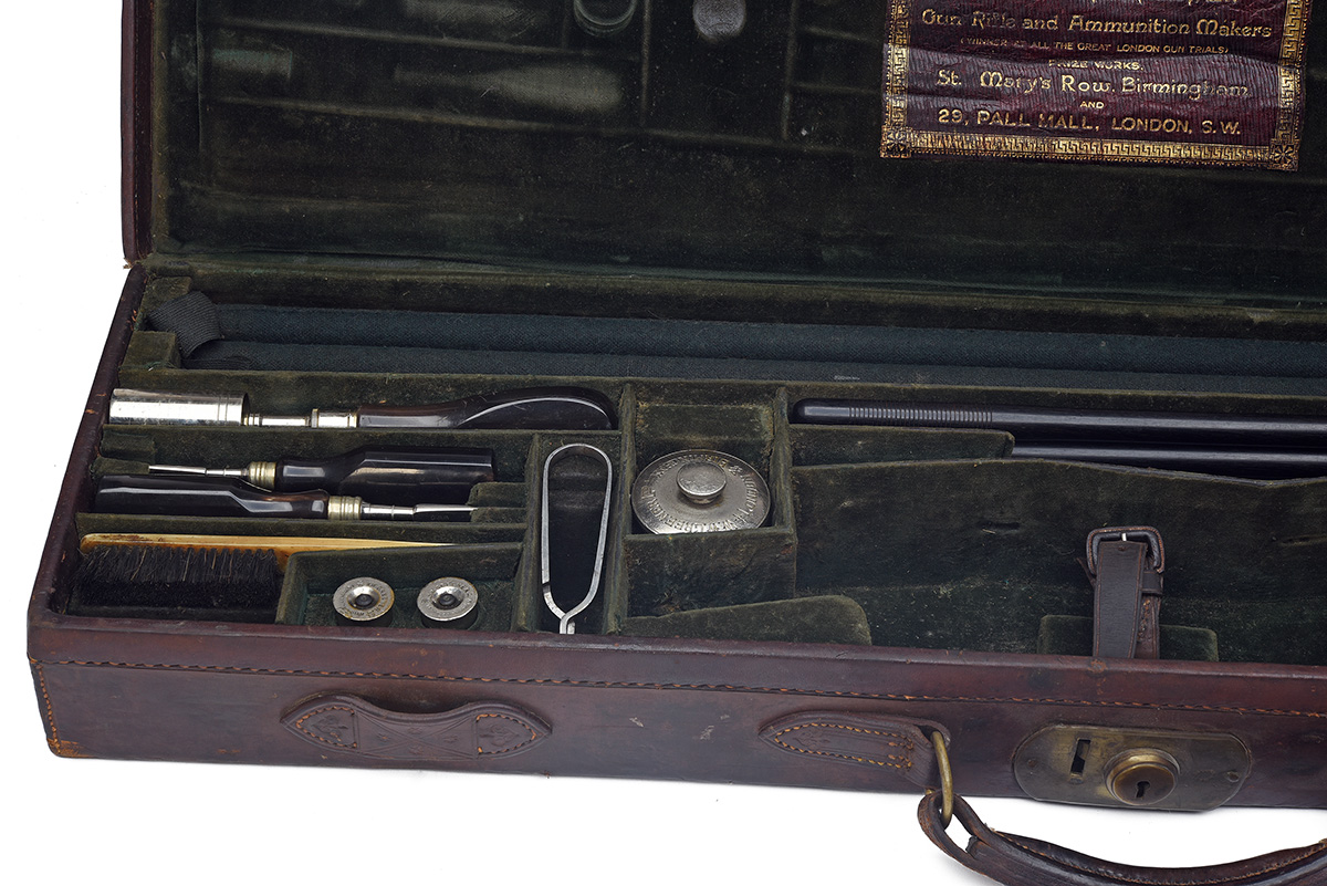 fitted for 30in. barrels, the interior lined with green velvet, a red Leather gold-tooled W.W. Greener Ltd. trade label, three-piece cleaning rod, chamber brush, two turn screws, cartridge extractor, W.W. Greener oil bottle, pair of 12-bore snapcaps, brass lock (key missing), the lid exterior marked 'W.G.P.'