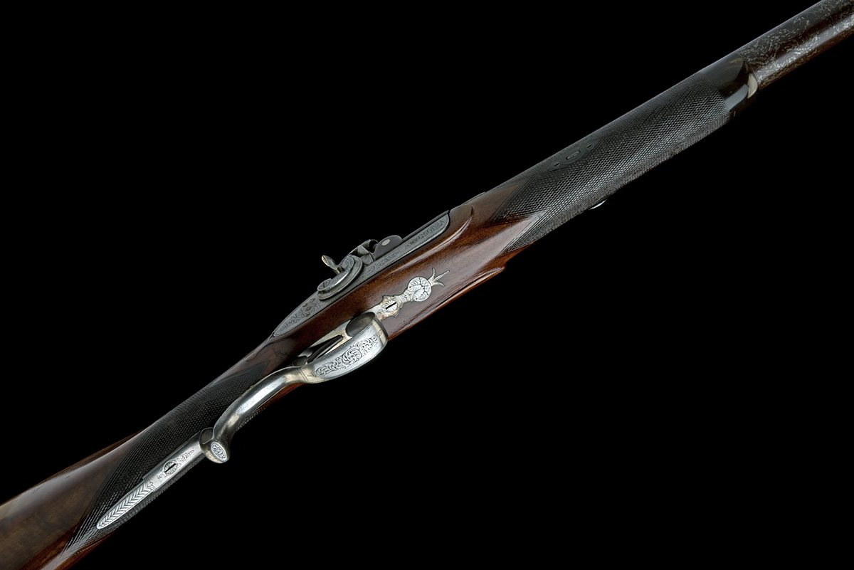 circa 1860, with round tapering damascus 33 1/4in. Birmingham proved barrel engraved with a steeple and scrollwork above the breech, bead fore-sight, short sighting rib and moulded side-pieces at breech, squared patent breech-block with platinum plug, border and scroll engraved top-tang, border and scroll engraved bar-action lock signed 'E. THOMPSON', moulded and engraved hammer, chequered walnut half-stock (some hairline cracks to side-cheek and behind lock), iron furniture, moulded horn fore-end tip and no provision for ramrod, trigger-guard and lock cleaned of finish
