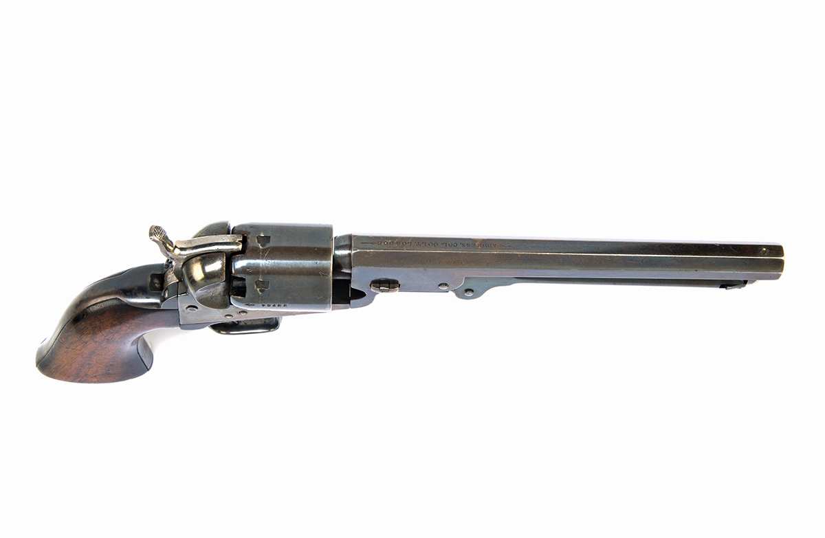 for 1855, with octagonal 7 1/2in. barrel signed 'ADDRESS COL COLT LONDON' on the top flat, with traces of London proof marks and a broad arrow stamp (rubbed), open iron frame marked 'COLT'S PATENT', six shot cylinder with London proof marks (scrubbed of scene), iron trigger-guard and backstrap, smooth flared one piece walnut grip, under barrel loading lever, with all matching serial numbers, the whole re-finished throughout
