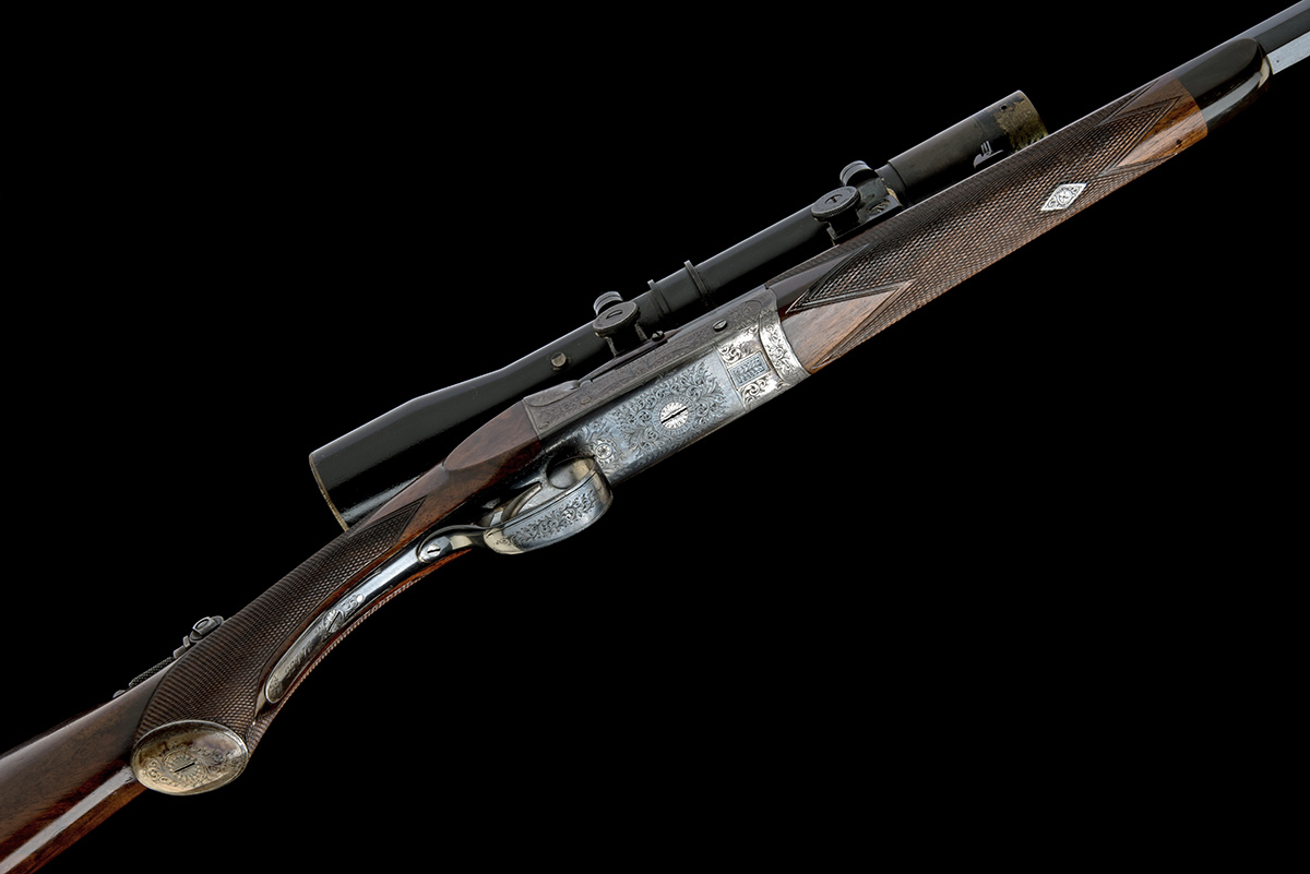 circa 1905, 26in. nitro reproved octagonal barrel (lined from .300 Rook) with partially file cut top flat, hinged bead and aperture fore-sight, open sights with two folding leaf sights, the breech end engraved 'HOLLAND & HOLLAND. 98. NEW BOND ST. LONDON.' and 'WINNERS OF ALL THE "FIELD" RIFLE TRIALS', with later rail mounted scope rings with a vintage military telescopic sight, marked 'TEL. STG. NO.53 MKI OS I075 GA AK & S No. 736. 1944' and with a broad arrow, the hand mounted with a folding adjustable peep sight (the comb well carved for the sight to seat flush when folded), non-selective ejector, automatic safety with gold-inlaid 'SAFE' detail, carved teardrop fences, removable striker disc, fine beaded border and bold acanthus scroll engraving, with central scrolling banners engraved 'HOLLAND & HOLLAND', retaining some colour-hardening and finish, 14 1/2in. well-figured pistolgrip stock with cheekpiece, engraved and colour-hardened steel pistolgrip-cap and blued steel buttplate, Hackett-style snap fore-end with horn finial, weight 7lb. 3oz.