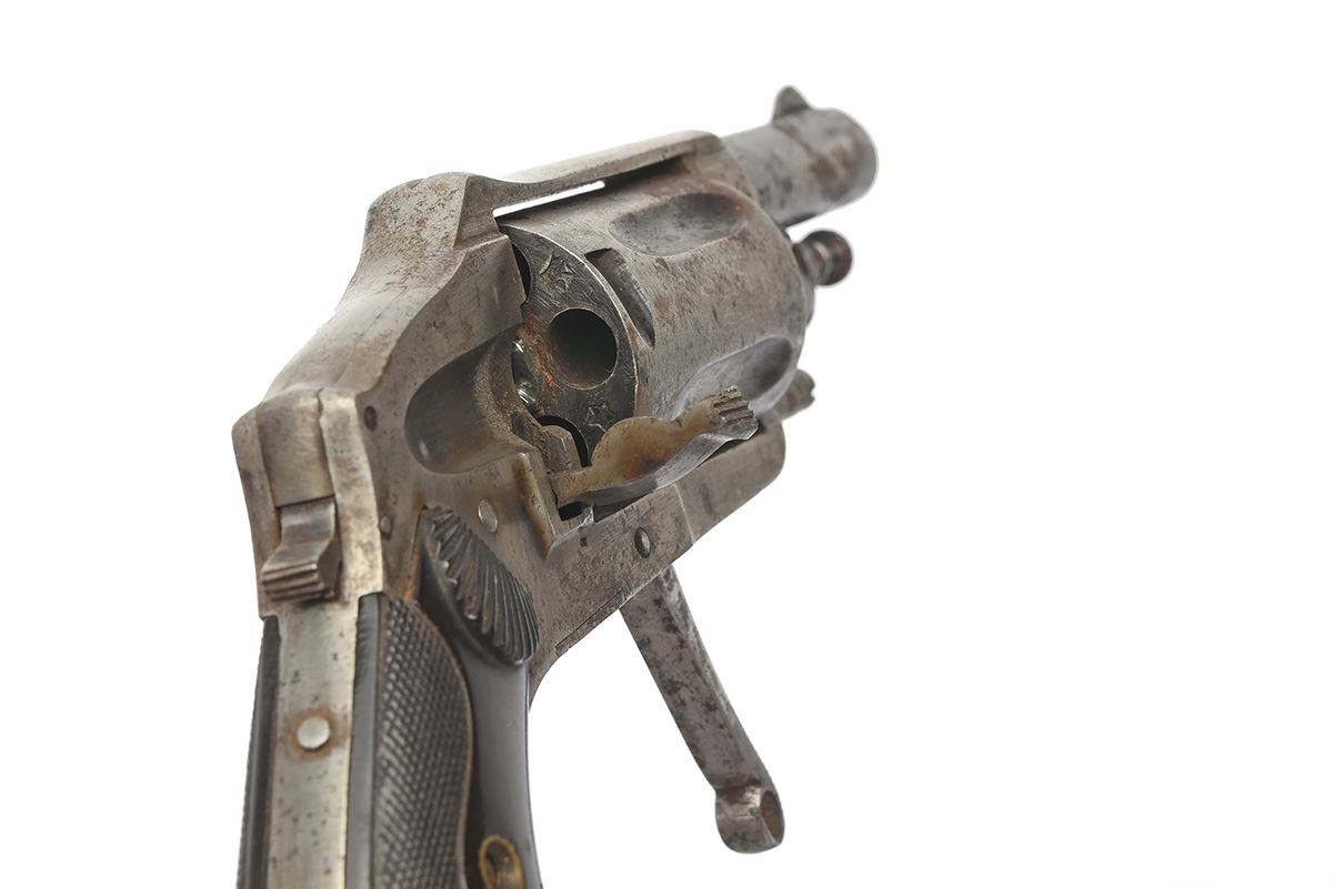 A 5.5mm (VELO-DOG) FIVE-SHOT POCKET-REVOLVER, serial no. 14, Spanish, with rose gold plaque dated for 1920, 1 7/8in. barrel, solid hammerless frame, blind fluted five-shot cylinder, folding trigger and chequered hard rubber grips, the left mounted with a plaque with an inscription in greek and dated 17-5-20, finish worn