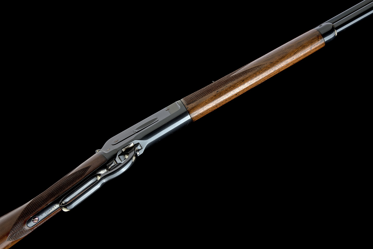 for 1912, with re-blued 26in. round profile barrel, the top-flat signed 'WINCHESTER REPEATING ARMS CO, NEW HAVEN CONN. USA' over 'PAT OCT 14 1884, JAN 20 1885' (re-applied), dove-tailed blade fore-sight, buckhorn rear-sight, plain receiver, the top-tang marked 'MODEL 1886, WINCHESTER, TRADE MARK REG IN U.S. PAT OFF', chequered straight-hand walnut butt-stock with iron chequered 'shotgun' heel-plate (repaired crack at wrist), chequered walnut fore-end with iron nose-cap and full-length under-barrel magazine tube, re-finished throughout