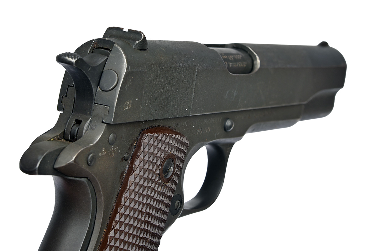for 1943, with grey phosphated 5in. barrel, phosphated slide showing strong 'duo-tone' finish, maker's details and patent numbers to right hand side, original sights and spurred hammer, phosphated frame with 'UNITED STATES PROPERTY' and '1911A1 U.S. ARMY' and a 'G.H.D.' inspector's mark (George H. Drury), chequered brown plastic grips and detachable magazine