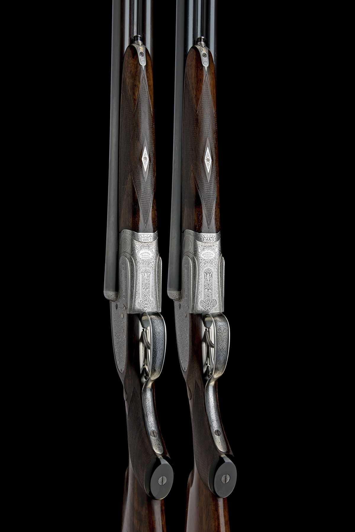 circa 1946, 25 1/8in. nitro chopperlump barrels, matt Churchill-ribs gold-inlaid 'XXV' and '1' and '2' at the breech ends, the tubes engraved 'E. J. CHURCHILL. (GUNMAKERS) LTD. ORANGE STREET GUNWORKS. LEICESTER SQUARE. LONDON.' and with bold acanthus scroll detailing at the breech ends, 2 1/2in. chambers, bored approx. 1/2 and 1/4 choke (No.1) and approx. 1/4 and 1/2 choke (No.2), minor dents No.2, incorporating W. Baker patent assisted-opening mechanism, patent no. 26903 of 27th November 1906, slender fences, toplevers gold-inlaid '1' and '2', automatic safeties with gold-inlaid 'SAFE' details, gold-inlaid cocking-indicators, double rolled-edge triggerguards, bold acanthus scroll engraving with ornate bordering, the lockplates with 'E. J. CHURCHILL', in scrolled cartouches, (No.2 right lockplate with 'E.J. CHURHILL'), the undersides with 'PREMIERE FINEST QUALITY', bright and blued finish overall, 14 7/8in. pistolgrip stocks with pistolgrip-caps and 1 7/16in. wooden extensions with buttplates, weight 6lb. 6oz., in their lightweight leather 'THE V.C. GUNCASE' double motor case