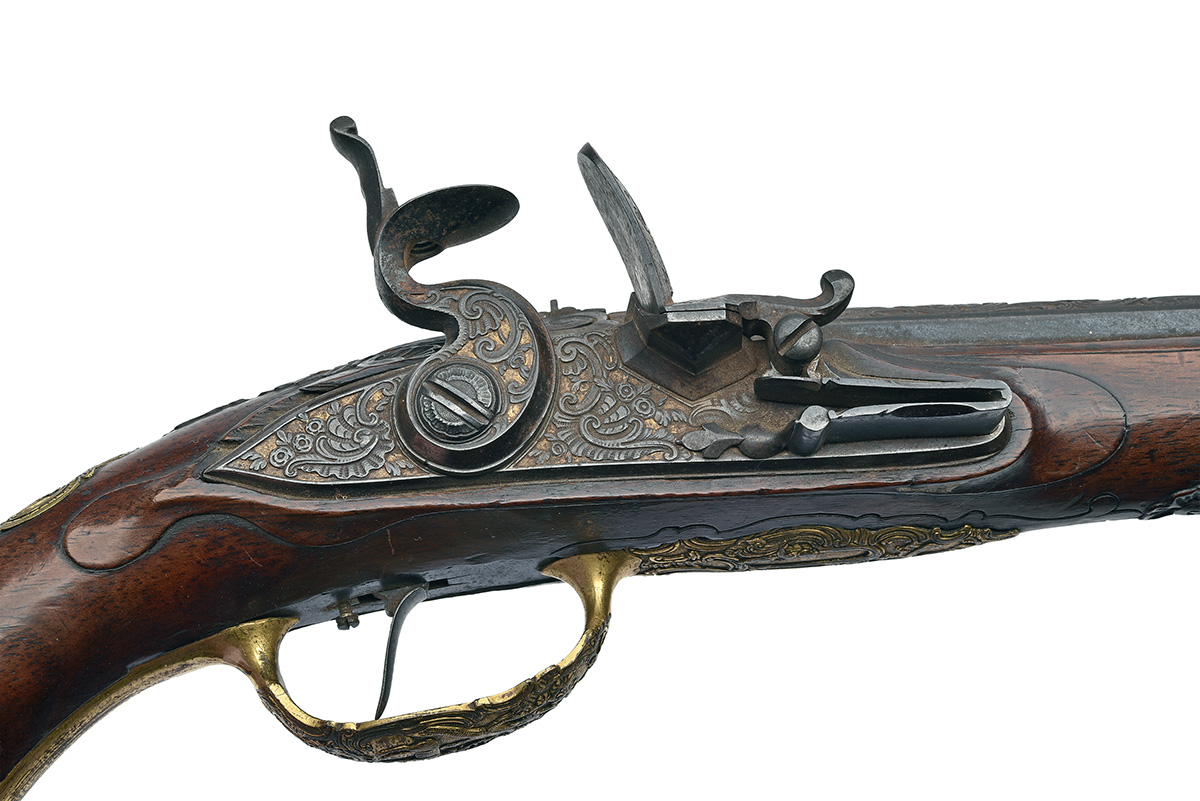 circa 1760, with iron 11 1/2in. barrel, the first half profusely chisel carved in relief with scrolls and shells around a central depiction of a standing stag, the forward section of barrel with raised moulded sighting rib signed 'IOH, IAC, KUCHENREUTER' in a yellow metal inlay, recessed muzzle, shallow blade fore-sight with inlaid foot, triple inlet poincons at breech, the top with a figure on horseback with the letters 'I' 'I' & 'K', the left and right with a crown and the same letters, standing notch rear-sight with two additional folding leaves, flat chisel-carved lock with gilded background, lozenge-shaped pan with unbridled frizzen, swan-necked cock with en-suite carving to the lock-plate (top-jaw and screw absent), walnut full-stock with moulded borders alongside the ramrod channel and around the finial and relief chisel carving around the apron and ramrod throat, rococo carved and gilded brass mounts, single set trigger and faceted ramrod pipes (ramrod absent, loss to fore-end tip)