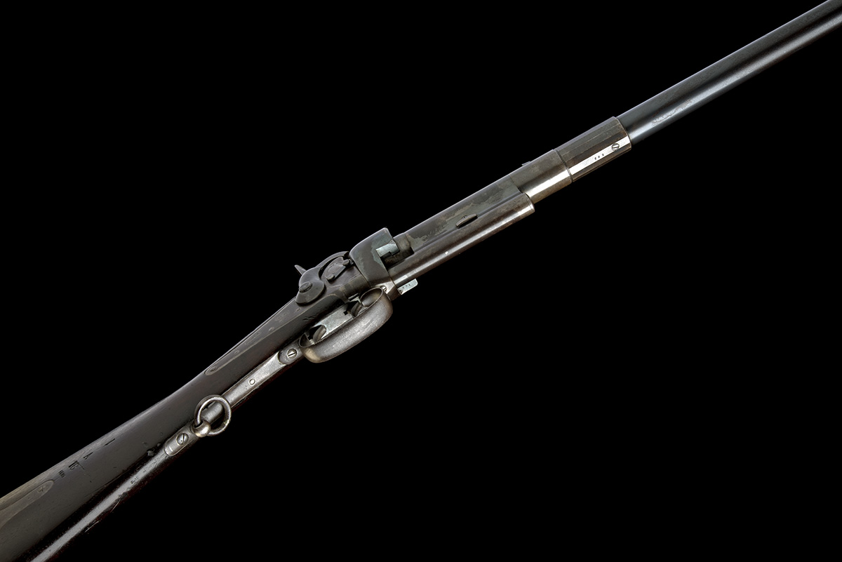 dated for 1856, with tapering round 18in. barrel, dove-tailed block and blade fore-sight, elevating ladder rear-sight, central section of outer barrel faceted for grip, plain receiver, long plain top-tang marked 'GREENE'S PATENT JUNE 27 1854', back-action lockplate fitted with 'Maynard's' tape priming system and marked 'MASS. ARMS CO. CHICOPEE FALLS USA 1856' a 'VR' crown cypher and 'MAYNARD'S PATENT SEPT 22 1845', plain hammer, walnut butt-stock with iron patch-box and semi-crescent heel-plate, the right side of butt stamped 'A' over '16' over 'RDMR', saddle-ring to the trigger-guard tang, large trigger-guard bow with two triggers, the front one unlocking the barrel for loading, ordnance stamps and no provision for fore-end, some shallow pitting and fair traces of original finish