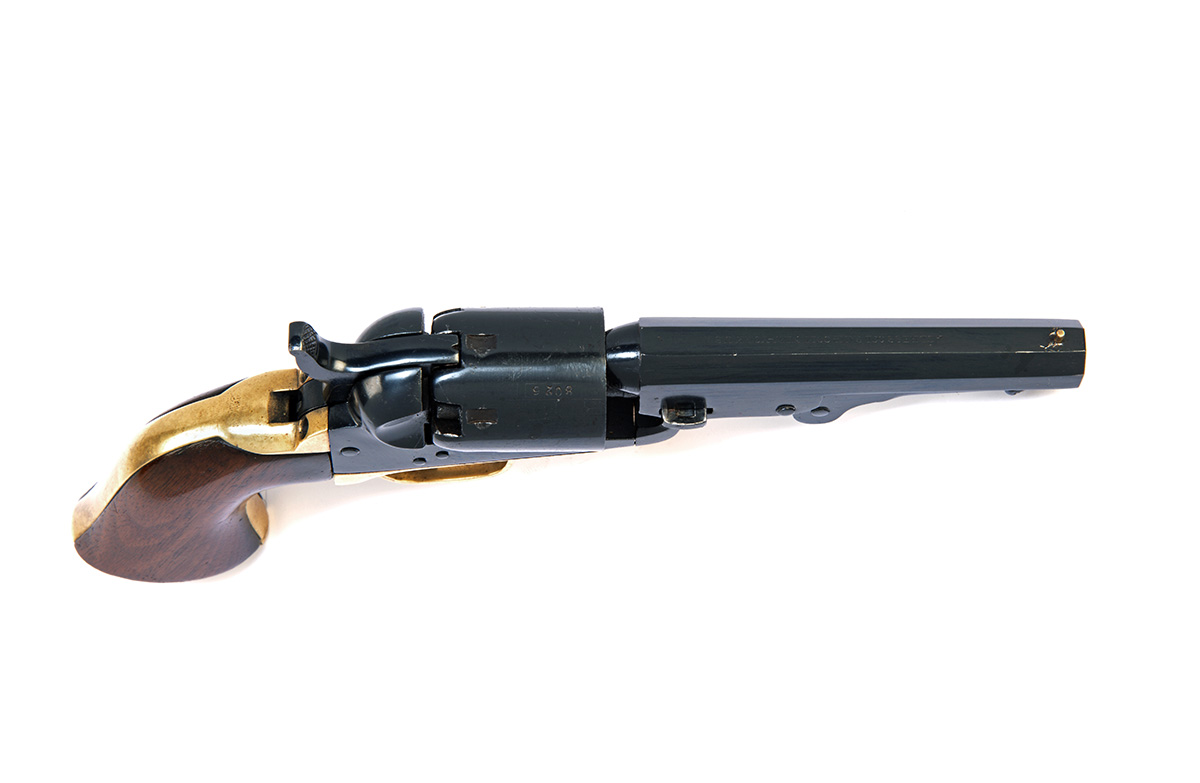 for 1867, 4in. octagonal barrel, the top flat signed 'ADDRESS SAML COLT NEW-YORK US AMERICA', un-numbered wedge, six-shot cylinder with traces of engraved scene and 'COLTS PATENT', open iron frame stamped 'COLTS PATENT' (rubbed), brass backstrap and trigger-guard with smooth flared one piece walnut grips, under barrel loading lever, matching serial numbers and re-blued finish overall