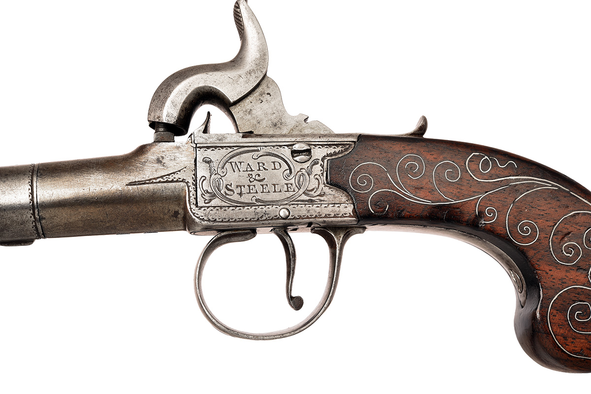 circa 1840, with multi-stage turn-off round 2 1/2in. barrel (cleaned), private proof stamps, borderline and scroll engraved squared boxlock action with radiused edges, left side signed 'WARD & STEELE', central hammer (cleaned), with top tang push-forward safety locking the hammer, slab-sided walnut grip with white-metal wire inlay