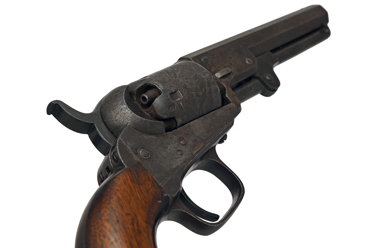 for 1854, with octagonal 5in. London proved barrel signed within brackets 'ADDRESS COL COLT LONDON', matching number wedge, open iron frame with dome-head screws (traces of colour), roll engraved matching number five-shot cylinder, iron grip-straps and trigger guard, smooth walnut grip and hinged under-barrel rammer