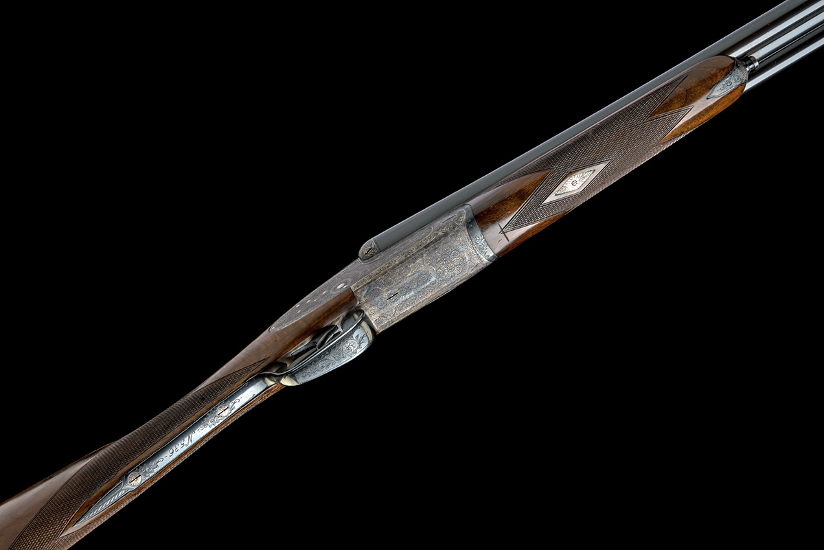 for 2000, 28in. nitro chopperlump barrels, 2 3/4in. chambers, bored approx. imp. cyl. and 1/2 choke, engraved arcaded fences, removable striker discs, automatic safety, gold-inlaid cocking-indicators, articulated front trigger, rolled-edge triggerguard, acanthus scroll engraving, some original colour-hardening and finish, 14 1/4in. stock, weight 5lb. 14oz.