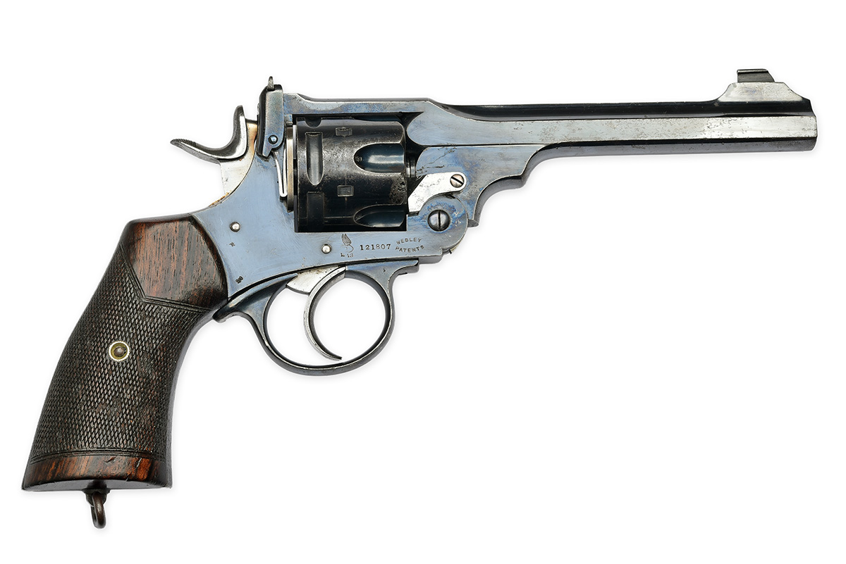 circa 1908, with blued 6in. barrel signed 'WILKINSON SWORD CO. PALL MALL LONDON' along the rib, ramp and blade fore-sight, the left side of top-strap signed 'WILKINSON-WEBLEY '05', stirrup barrel latch with drift-adjustable blade, break-open frame with fluted automatic ejecting quick release cylinder (some pitting to leading edge of one chamber), double action mechanism, chequered walnut grips with squared heel, the left grip marked 'W1302' at heel and inlet with an oval white metal escutcheon at head engraved 'R.V.W.', lanyard swivel at heel, much original finish remaining and in its English market leather storage case lined and compartmented in ruby baize, Wilkinson trade label inside lid and including a tray for ammunition, and sundry accessories