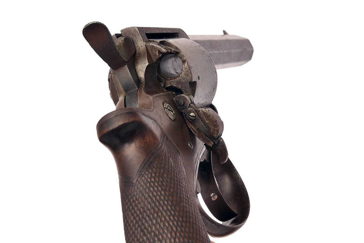 1862 series circa 1866, with 5in. octagonal barrel, the top-flat signed 'E.M. REILLY & CO. OXFORD ST. LONDON', engraved band at muzzle, crescent fore-sight, borderline engraved solid frame with sighting groove to top-strap, five-shot recessed cylinder with friction spring, side loading gate, double action mechanism, chequered walnut semi saw-handled grip, shallow domed butt-cap with no provision for ejector and guarded trigger