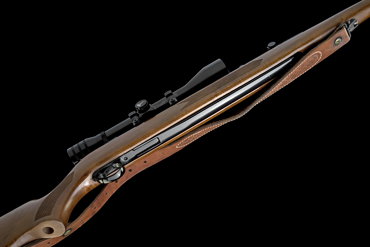 one of one thousand rifles made to celebrate the 100th anniversary of BSA in 1982, with blued 19 1/2in. barrel (some corrosion marks), ramp fore-sight, micro-adjustable rear-sight, tap-action loading, the air-chamber marked 'BSA PILED ARMS CENTENARY 1982 ONE OF ONE THOUSAND', special edition chequered walnut three-quarter stock with raised comb and cheek-piece (pistol-grip lacking special 'BSA piled arms' cover), ventilated rubber recoil pad, wood schnabel fore-end tip, fitted with its original issue 'BSA' 4x40 telescopic sight and mounts and special leather sling, in its original vinyl gunbag (carry handles missing)