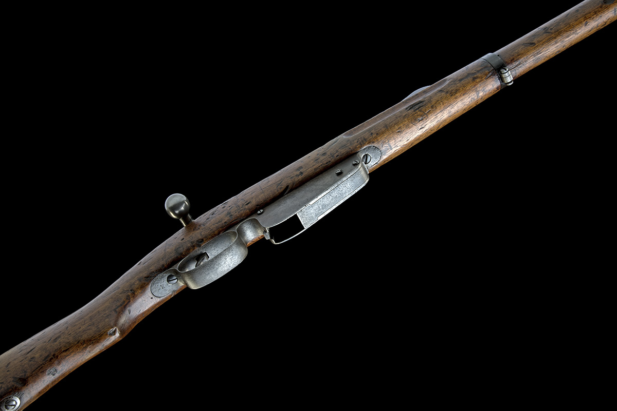 circa 1887, with reblued 32in. barrel, block and blade fore-sight, elevating tangent rear-sight, refinished receiver (some blinded pitting) with brushed bright bolt and straight bulbous bolt-handle, walnut semi pistol-grip full-stock, fixed magazine, two barrel-bands and nose-cap with stacking spike and bayonet-lug, woodwork with heavy bruising and some amateur carving