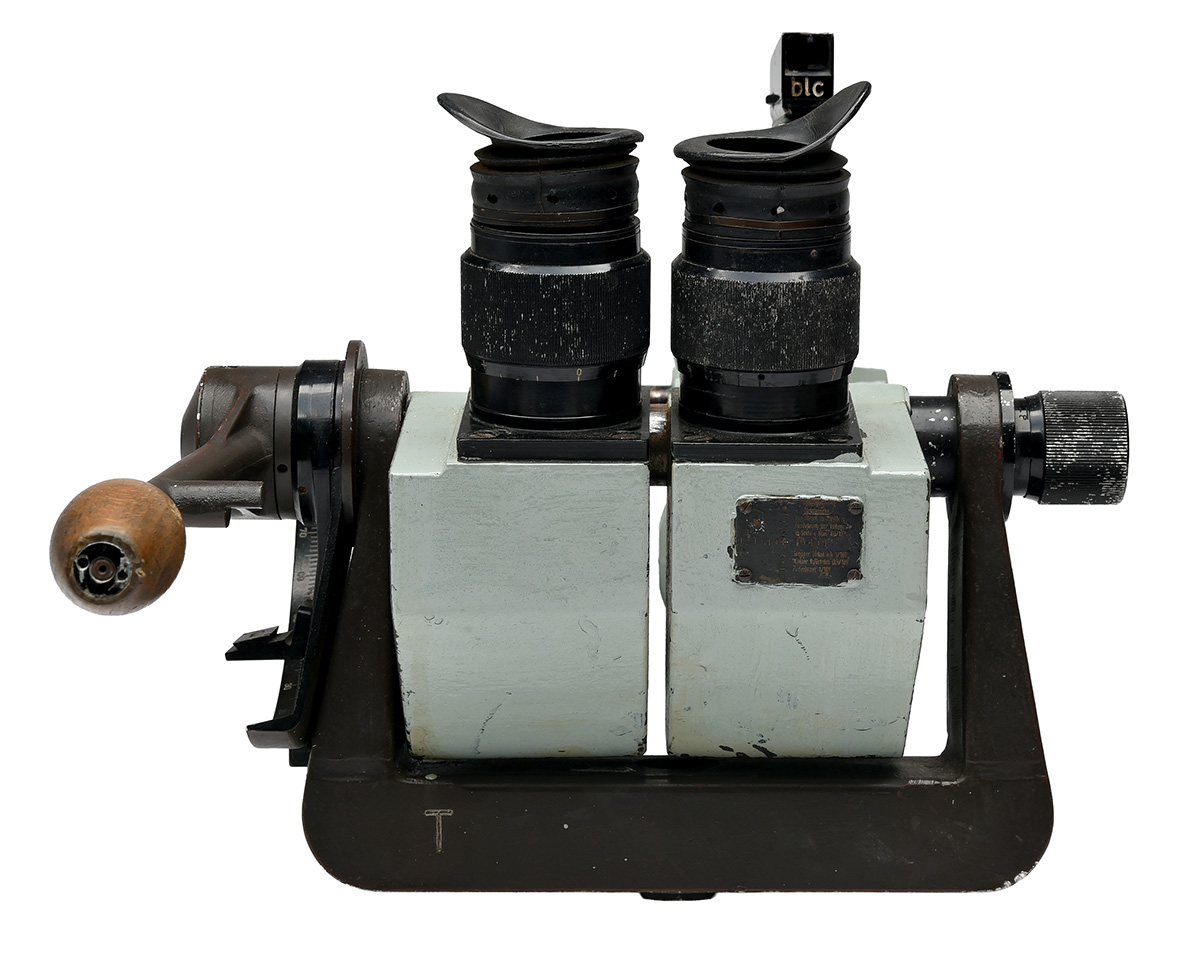 serial no. 62027, believed used for coastal anti aircraft batteries, comprising of two pale blue-grey painted telescopes with near right-angled eye-pieces on a squared body, the rear of body with ranging plaque, the right side marked 'eug' (maker's German wartime code) above '10x80' and a large German Kriegsmarine eagle flanked by 'M' and 'IV/I' above the serial number, twin eye-pieces with rubber eye-cups, large swivelling bracket with two wooden handles (one currently detached), the right telescope mounted with a bracket for a reflex aiming sight marked 'blc' (Zeiss)