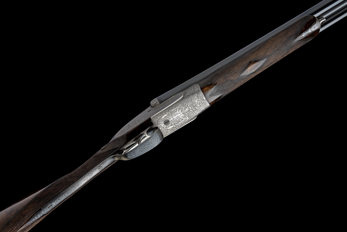 for 1926, Belgian made, 28 3/8in. (72cm) Toledo-steel works nitro barrels, finely file-cut rib with finely engraved bands of foliate design at the breech ends, the tubes engraved in fine script 'Jozef Splichal Syn. Krakow', 2 3/4in. chambers, bored approx. imp. cyl. and 1/4 choke, treble-grip action with hidden third bite, removable striker discs, automatic safety, articulated front trigger, the fences, short side bolsters and toplever thumbpiece very finely carved in relief with floral and ribbon motifs, the action, lockplates and furniture very finely engraved with fine acanthus scrollwork interspersed with ribbon work and floral sprays, the underside with an intricate art nouveau centrepiece, the drapes engraved 'JOZEF SPLICHEL KRAKOW', the triggerplate signed 'H. COROMBELLE', bright and blued finish overall, 14 7/8in. highly-figured stock including 7/8in. wooden extension, weight 6lb. 6oz., in a canvas case