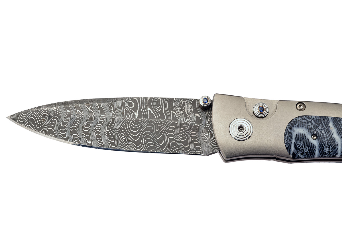 number '65' of a limited edition of '500', with stainless-steel 'Ripple' damascus 3 1/2in. drop-point blade signed on the left side with the subtle 'WH' trademark in a circle above 'STAINLESS DAMASCUS', stainless thumb-opening assist stud with sapphire end-stone, satin-finished titanium bolsters, stainless thumb-opening lock button further mounted with a sapphire end-stone, the scales of fossilised 100,000 year old polished coral, turned pillar spacers between the bolsters, the heel fitted with a forged lanyard swivel mounted with a tactical cord lanyard with forged silver finial, unused in its makers presentation inner and outer boxes with certificate of authenticity dated May 10 2016 and a signed leather pouch with belt-clip