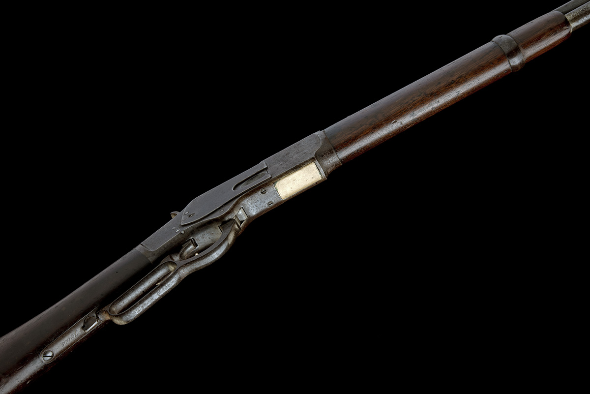 for 1881, with round 20in. barrel, the top signed by the maker and with patent dates of '1866' & '1860' and further signed 'TRULOCK & HARRISS, 9 DAWSON ST. DUBLIN', block and blade fore-sight, twin blade 'L' shaped carbine rear-sight, period London proofs, the receiver with further signature from the retailer to the left side, loading port to the right, automatic retracting dust-cover with applied guide-rail to receiver top, exposed hammer, top-tang without provision for a peep-sight and marked 'MODEL 1873', loose saddle-ring, walnut butt, the iron carbine heel-plate with central trap containing the original dismountable cleaning rod, brass cartridge lifter, walnut fore-end with single barrel band and full-length magazine with further band at nose, traces of finish