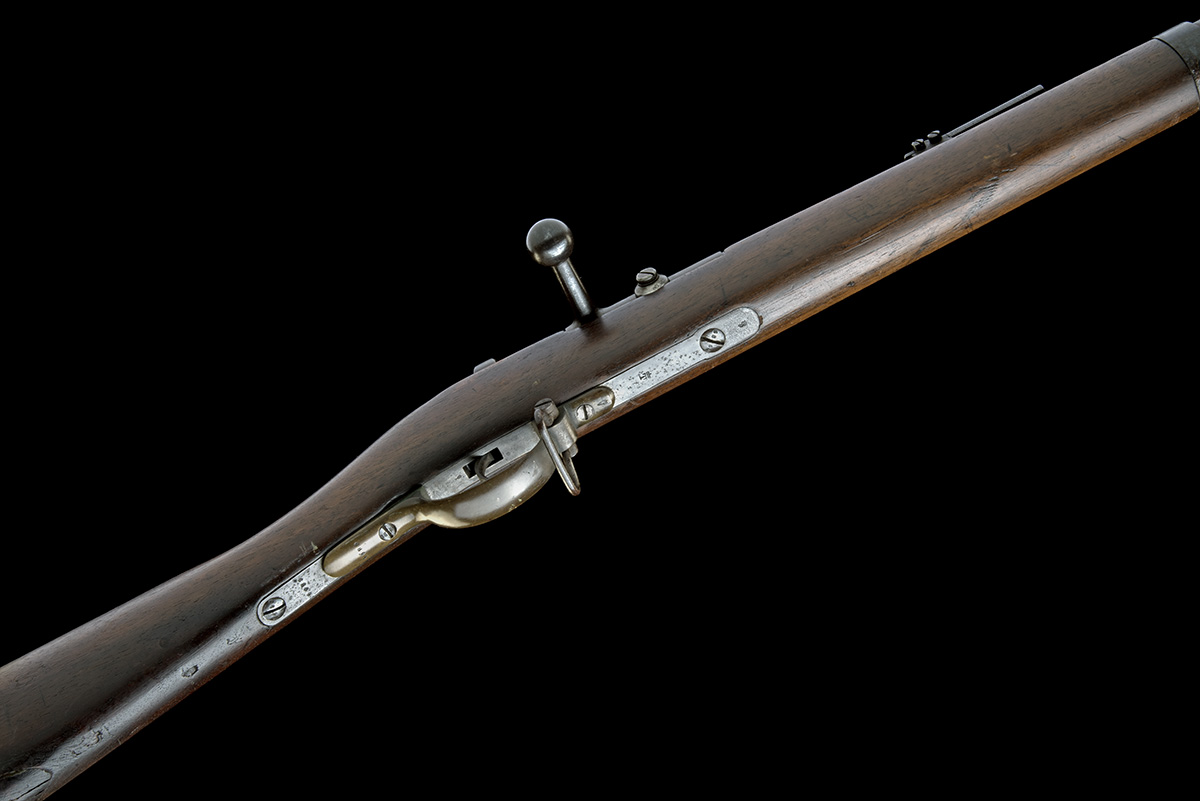 dated for 1878, with 33 3/4in. barrel, block and blade fore-sight, broad elevating rear-sight with set ranges, octagonal form receiver and breech, the breech signed on the top-flat 'DANZIG' below a crown, model designation and date to receiver, matching number bolt with straight handle, flag safe to rear, walnut full-stock with traces of ordnance stamps (toe crudely repaired), two iron barrel-bands, sling swivels and nose-cap, under barrel jag-tipped clearing rod and applied brass trigger-guard bow