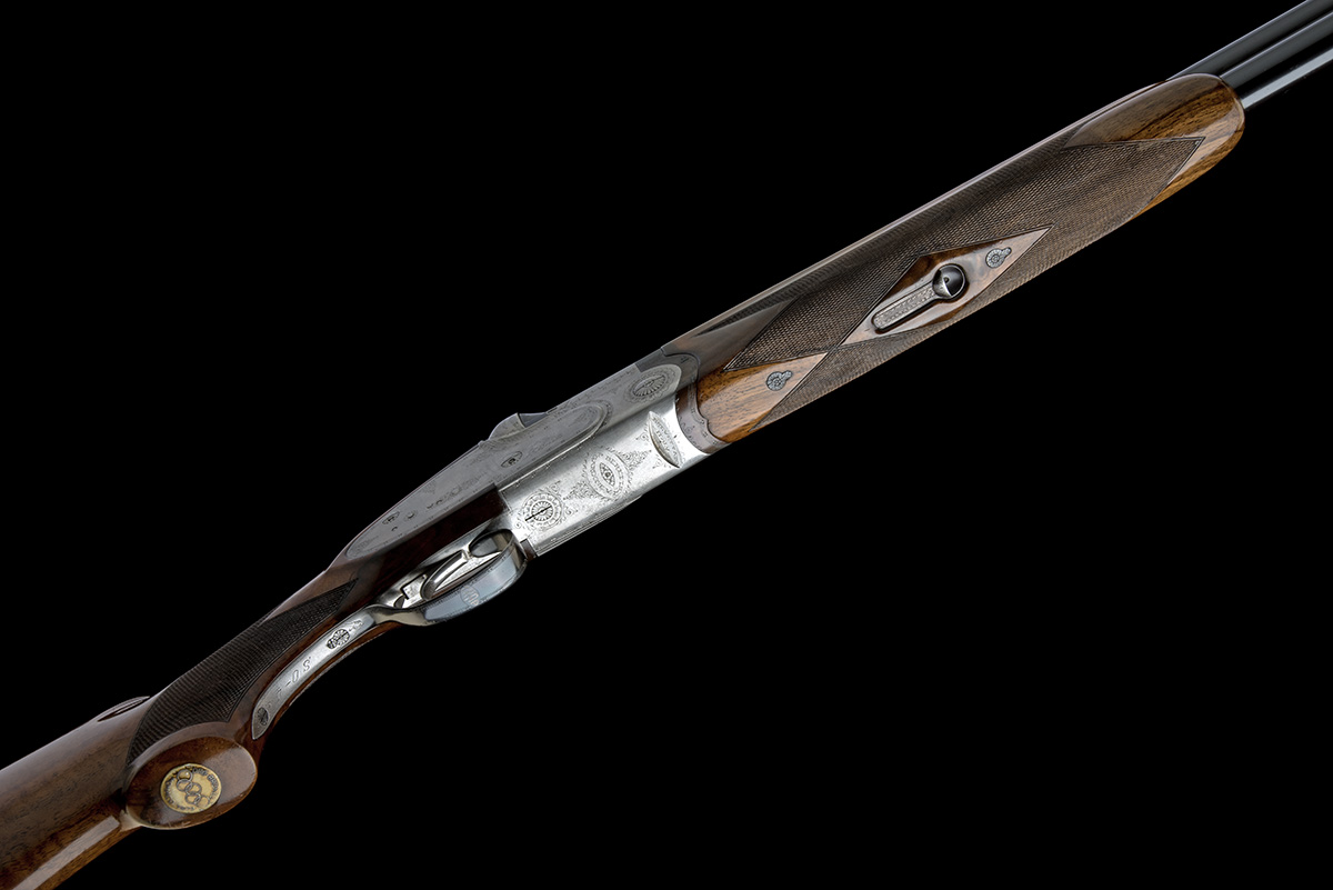 for 1976, 29 7/8in. (70cm) nitro barrels with 8mm ventilated matt top-rib, 2 3/4in. chambers, Teague multichokes (with spares), hold-open toplever, manual safety, non-selective single-trigger, ornate border and acanthus scroll engraving, bright finish, 13 1/2in. stock including buttplate, semi beavertail fore-end, weight 7lb. 6oz., in its makers universal case