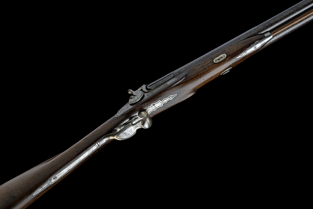 Belgian circa 1855, with octagonal blending to round laminated 32in. barrels, slightly raised concave top-rib, borderline engraving to the long top-tang, borderline engraved locks, the bars with deeply chisel engraved framed cartouches, the left depicting a running deer, the left a running leopard, unchequered walnut half-stock (some inlets, probably from manufacture), iron furniture including flat faced trigger guard bow and later brass-tipped ramrod