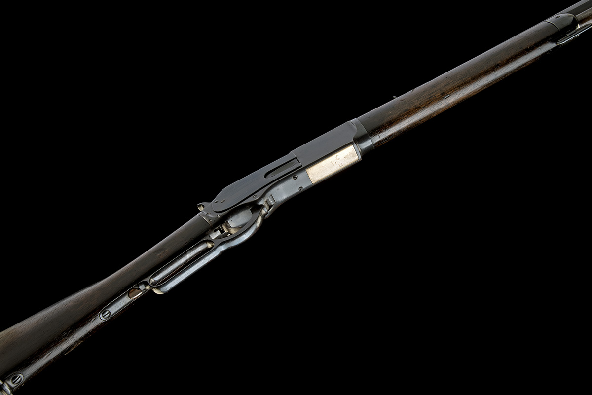 for 1877, early second model with octagonal 28in. barrel, dove-tailed fore-sight, a blanked-off dove-tail bisecting the signature and a further large blanked-off dove-tail originally for an 'Africa' type multi-leaf rear-sight at breech, now fitted with a conventional buckhorn sight, reblued receiver with early style dust-cover with central chequered oval thumb-piece and applied guide-rail, exposed hammer, the trigger possibly originally a set type, top-tang marked 'MODEL 1876', walnut butt-stock with iron crescent heel-plate, central trap, iron finger-lever, brass cartridge lifter with calibre designation and walnut fore-end with iron nose-cap and full-length under-barrel magazine, fitted with period sling swivels