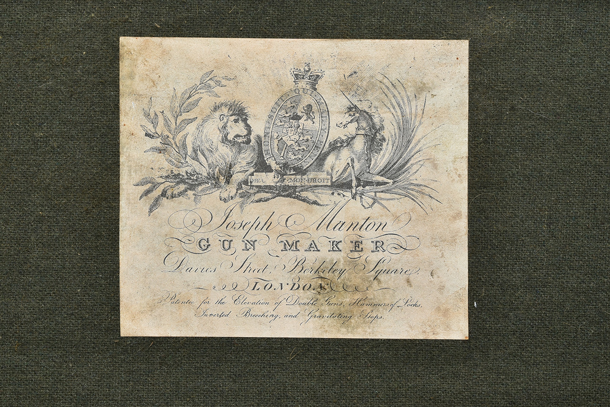 fitted for 31in. barrels, the interior lined with green baize, Joseph Manton trade label, central brass lock (key missing), two brass clasps, the lid exterior with a brass flush-fitting carry handle