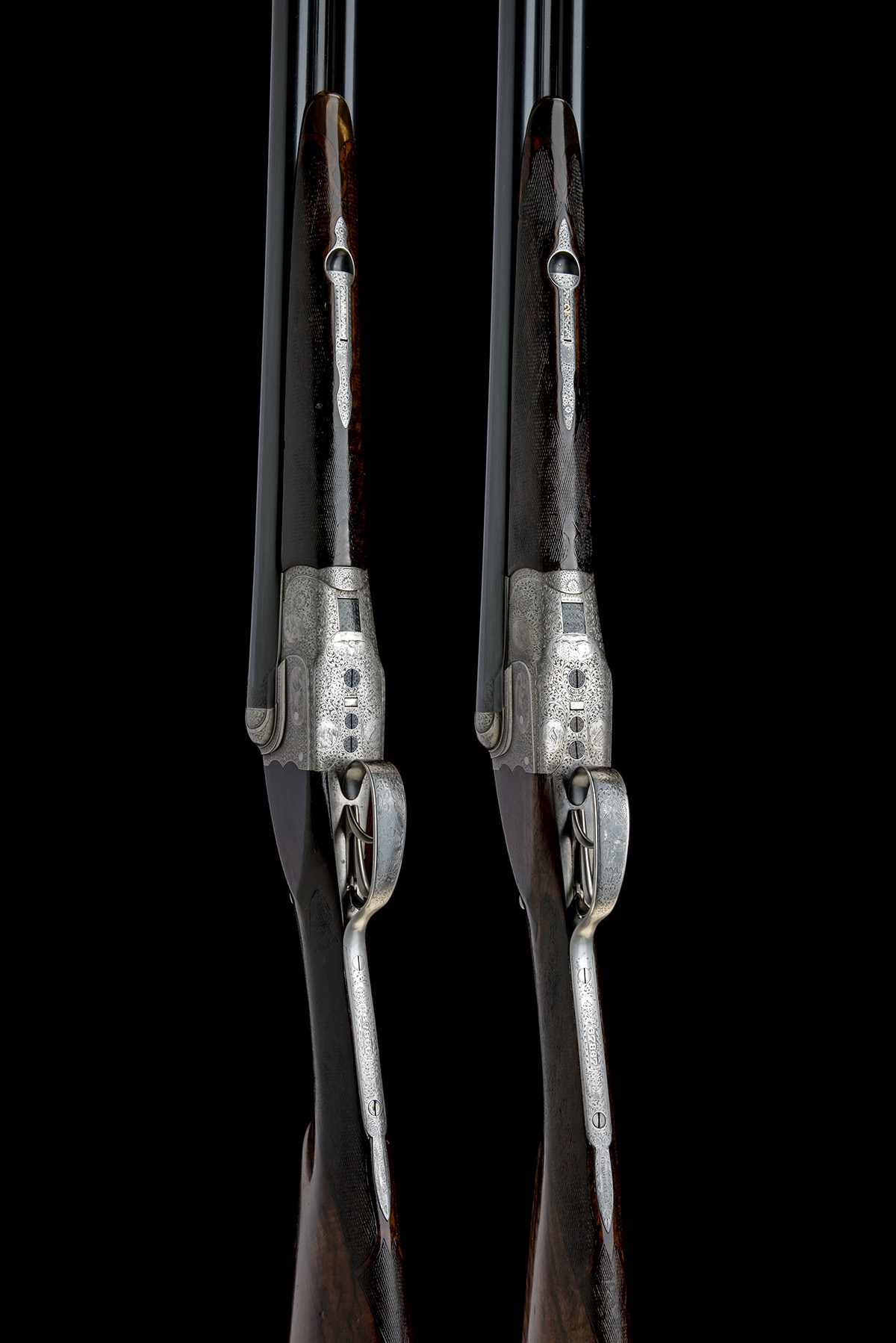 Provenance: The makers have kindly informed us that these shotguns originated from an order placed by their London establishment. They were ordered as a true pair initially, but built with different stock dimensions and at a cost of 125 guineas each. The No.1 gun was engraved by Tomlinson and completed December 1927 and the No.2 gun was completed February 1931. The original owner's name is not recorded