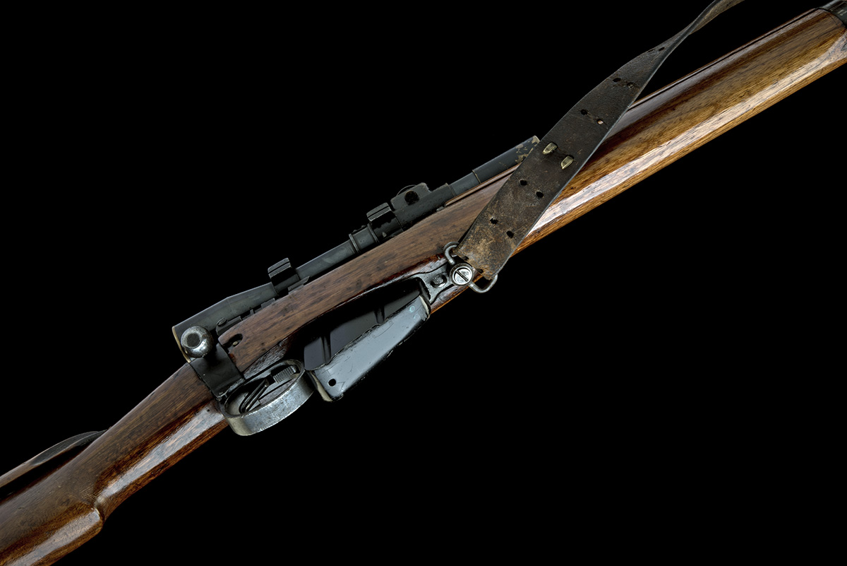 dated 1944, 25 1/4in. nitro reproved barrel (in 1985), block and blade fore-sight with side protectors, folding aperture rear sight (battle sight ground off), marked 'SM', blued receiver fitted with screwed on and staked threaded pads, and No. 32 telescopic sight, marked 'TEL. STG. N. 32. MK2. H.B.M. Co. OS. 1650A REGd. No. 11256', sight mount marked 'N 92' and 'D37982', with its metal tin marked 'CASE STG, NO.8 MARK I. B.E. LTD. OS906A' and '32 MK2 OS. 1650A. NO. 11256. M47C. D37982. NO.4. T. MKI.', the rings marked 'Z227' and 'Z228' at their bases, receiver ring marked '7*' and 'ACA', receiver wall marked 'No.4 MK. I. T.', the butt-stock collar marked 'M47C. 1944. D37982. TR.', manual safety, detachable box magazine, full stock, 13in. pull including brass buttplate with central trapdoor, raised cheekpiece, leather sling, weight 9lb. 50z. (unscoped) and 11lb. 9oz. (scoped)