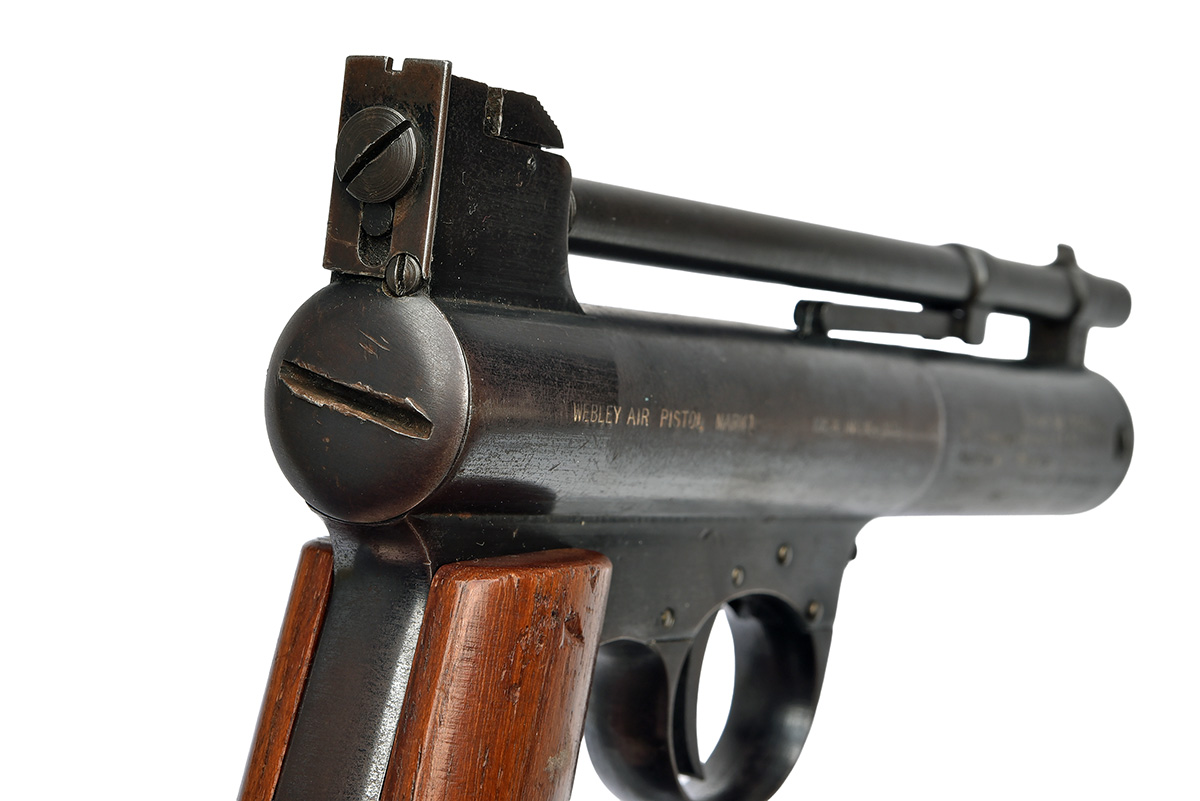 circa 1933, with blued 7 1/8in. barrel, pull-back barrel latch, adjustable rear-sight, blued stepped air-chamber with five lines of patents to the left side of nose, maker's details further back, six lines of patents to the right side of nose with model details behind, blued frame with four-pin trigger unit, rotating safety catch and trigger adjuster with locking screw, smooth walnut grips with Webley 'winged bullet' medallion inlet in the left example, much original blued finish remaining