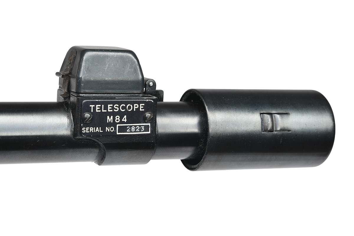 the box dated for 1969, the sight with blued steel 11 1/4in. body, sacrificial glass lens-cover to front, sliding steel sun-shade to rear, set-back adjustment wheels with flip-open spring-steel covers, the side marked 'TELESCOPE M84' and the serial number, post and crosswire graticule, no maker's details, the original card carton with packing pieces and matching details, appearing unissued