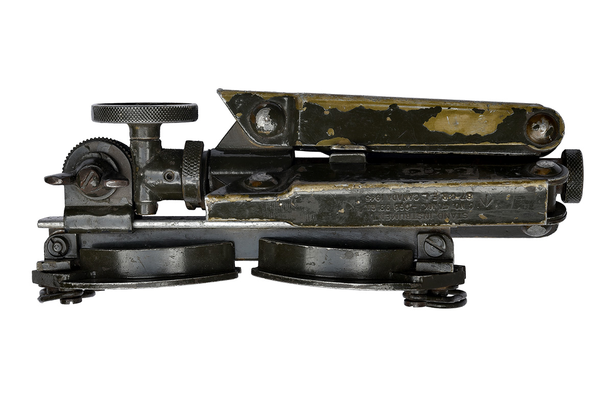 the telescope dated for 1944, with olive green leatherette covered body, forward mounted sunshade, the single draw in green-grey anodised alloy, the rear of telescope marked around the ocular lens 'TELESCOPE, OBSERVING, SNIPER'S CMK 1' above '25x50' and also 'CGB 32 MA' and 'R.E.L. CANADA' over '1944' and '86C' (hard rubber eye-piece absent), 25in. overall extended, in its olive green hard rubber covered aluminium transit case marked similarly but dated 1945, bayonet fitting end-cap (dented), webbing carry strap (split) and with its seldom encountered folding stand or tree-clamp marked 'STAND, INSTRUMENT' also by 'R.E.L. CANADA' and dated 1945