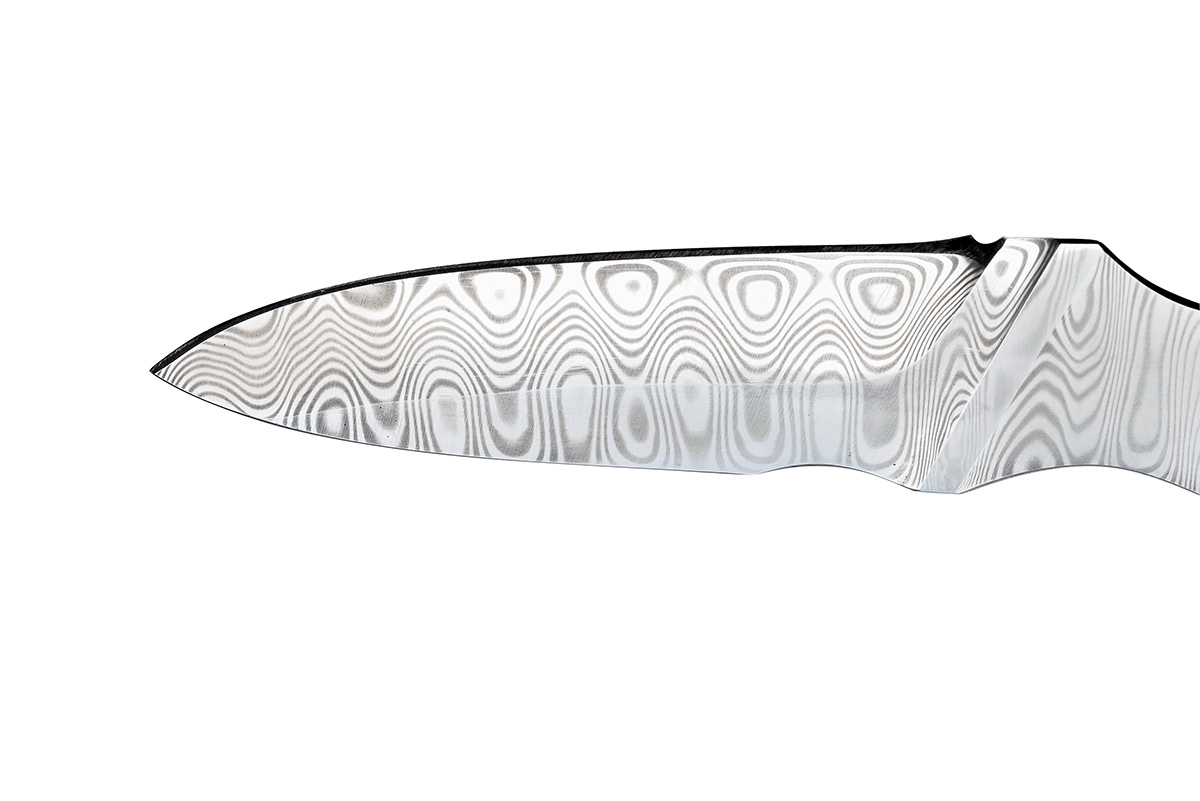 recent but unreferenced, made from a single billet of ladder damascus, with 2 3/4in. blade, the back edge with shallow thumb depression, guardless design with narrow neck and unscaled hilt, gilt 'PUMA' logo inlet to both sides and in a moulded abs plastic brown Puma trademarked scabbard designed to be hung from a necklace (not supplied)