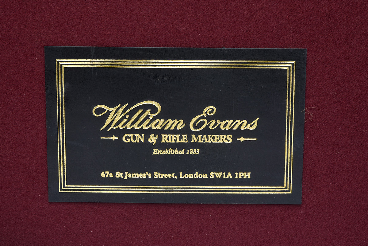 fitted for 30in. barrels, the interior lined with maroon baize, a leather William Evans trade label, cleaning rod, oil bottle, two pairs of 12-bore snapcaps, three turnscrews, central brass push-button lock (key missing), the lid exterior marked 'A.E.B.'