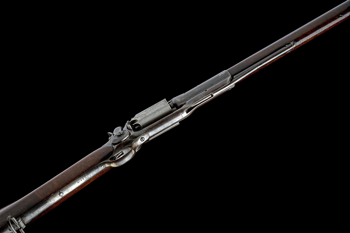 circa 1860, with blued 31 3/16in. octagonal to round barrel, block and blade fore-sight (to accept a socket bayonet), standing notch 100yd. rear-sight with additional folding 300 and 600yd. leaves, solid frame (some pitting and traces of finish), the sunken sighting groove to top-strap signed 'COL COLT HARTFORD CT. U.S.A.', fully fluted five-shot cylinder with traces of patent markings in one flute, the left side of receiver marked 'COLT'S PATENT NOV 24TH 1857', side hammer and rear-mounted cylinder arbor, walnut butt-stock (old hairline crack alongside front of comb, lower tang with old repair), iron heel-plate with central trap containing the brass section of cleaning rod, small trigger guard, full-length walnut fore-end with two iron barrel-bands, under-barrel articulated rammer and iron cleaning rod front section, strong traces of finish especially on barrel