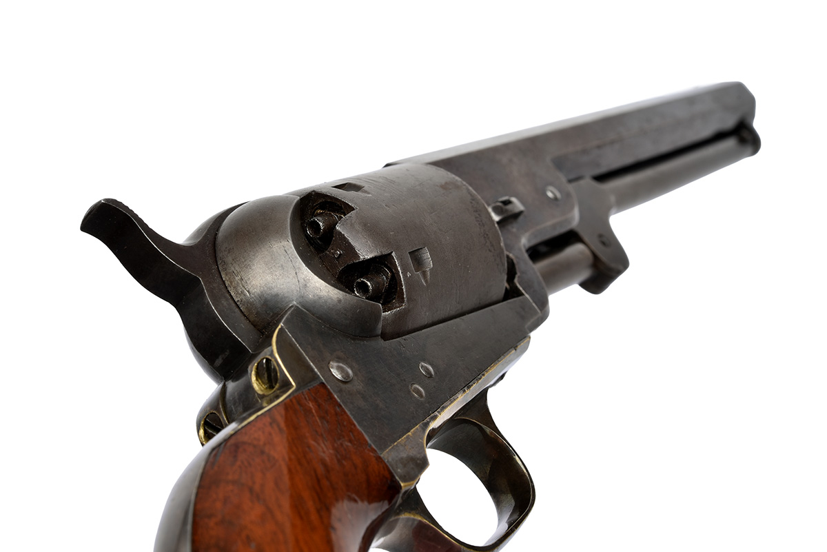 for 1854, with blued octagonal 7 1/2in. barrel signed on the top-flat 'ADDRESS SAML. COLT NEW-YORK CITY', bead fore-sight, matching number barrel wedge, open iron frame with traces of colour hardening and marked 'COLTS PATENT', six-shot cylinder with matching number and roll engraved scene (finish lost), single action mechanism, silver plated grip-straps and small trigger guard bow, smooth flared walnut grip and articulated under-barrel rammer, strong amount of original finish remaining except where noted