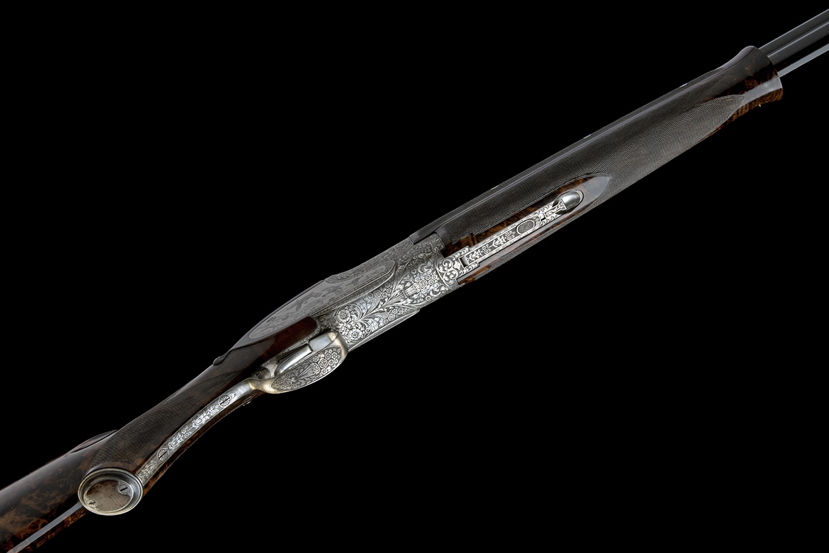 for 1975, 29 7/8in. nitro barrels with 6mm solid raised matt top-rib, 2 3/4in. chambers, bored approx. imp. cyl. and 1/2 choke, light internal pitting, three-piece fore-end, hold-open toplever, manual safety with integral barrel selector switch and gold-inlaid 'O', 'U' and 'S' details, the action and furniture carved in high relief with stylised art nouveau scrolls and floral sprays on a finely matted background, the decorative sideplates with finely engraved game scenes of pheasant to the left and French partridge to the right, the triggerplate signed 'CAPECE',15 1/8in. highly-figured burr walnut pistolgrip stock with engraved skeletal steel pistolgrip-cap, repaired crack at hand, weight 7lb. 9oz.